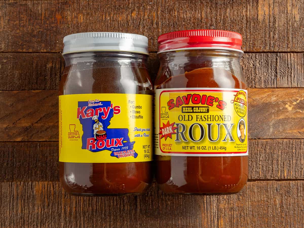 - Use jarred roux. While some cajun purists might scoff at using a pre-made roux, I’m here to say you can’t tell the difference between a gumbo made with homemade roux vs store bought roux. The two most popular brands are Kary’s Roux and Savoie’s Roux. They are both a nice dark brown color, perfect for a rich flavorful gumbo. You can also make a big batch of roux yourself and store it for later.